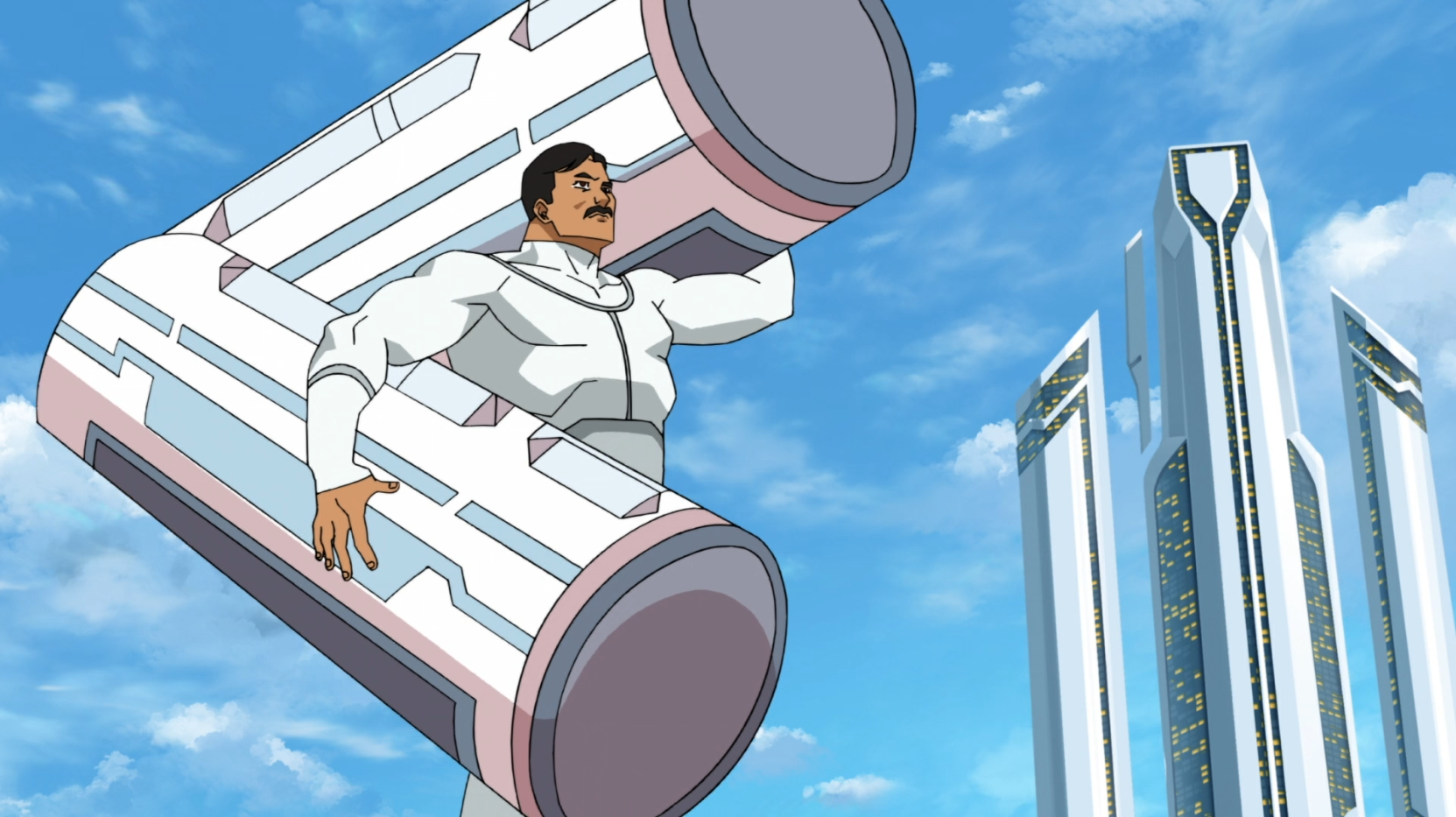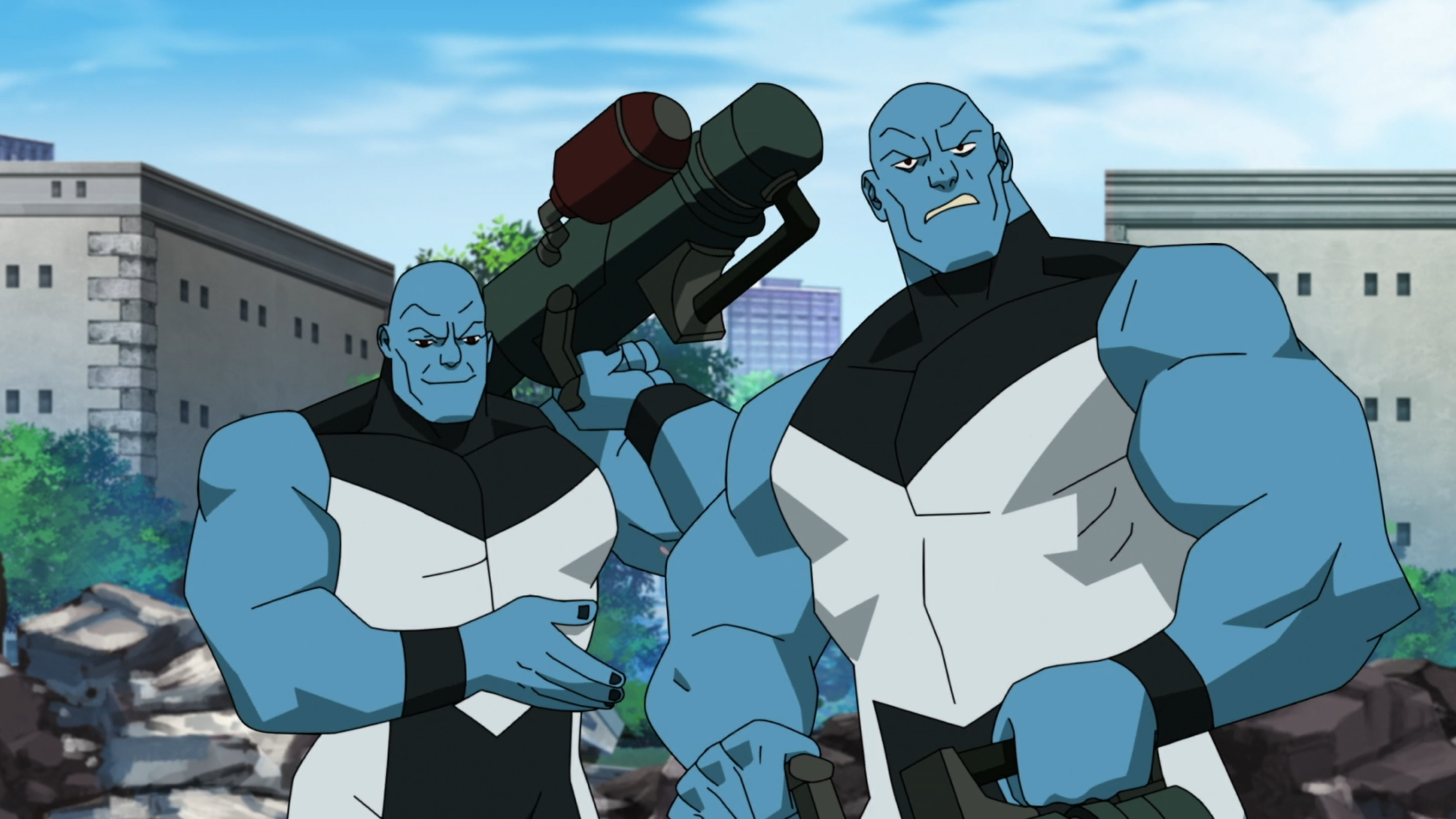 The Mauler Twins make their debut in the series premiere, 'It’s About Time.' These blue-skinned, hyper-muscular brilliant scientists are seen here wielding high-tech heavy weaponry during an assault on the White House. The scene establishes their ongoing dynamic: a constant, prideful argument over which one is the original creator and which is the mere clone.