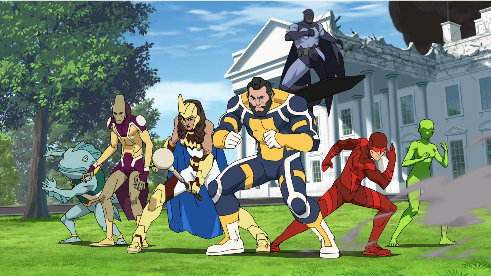 In the opening sequence of Invincible Season 1, Episode 1, 'It’s About Time,' the Guardians of the Globe arrive to defend the White House from the Mauler Twins. This shot showcases the original roster's diverse power sets and iconic costumes, establishing them as Earth's premier superhero team and a clear homage to classic comic book archetypes like the Justice League.