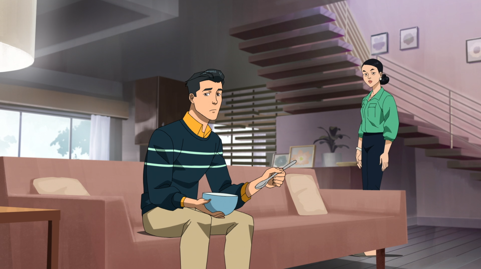 A pre-superpowered Mark Grayson sharing a quiet moment at home with his mother.