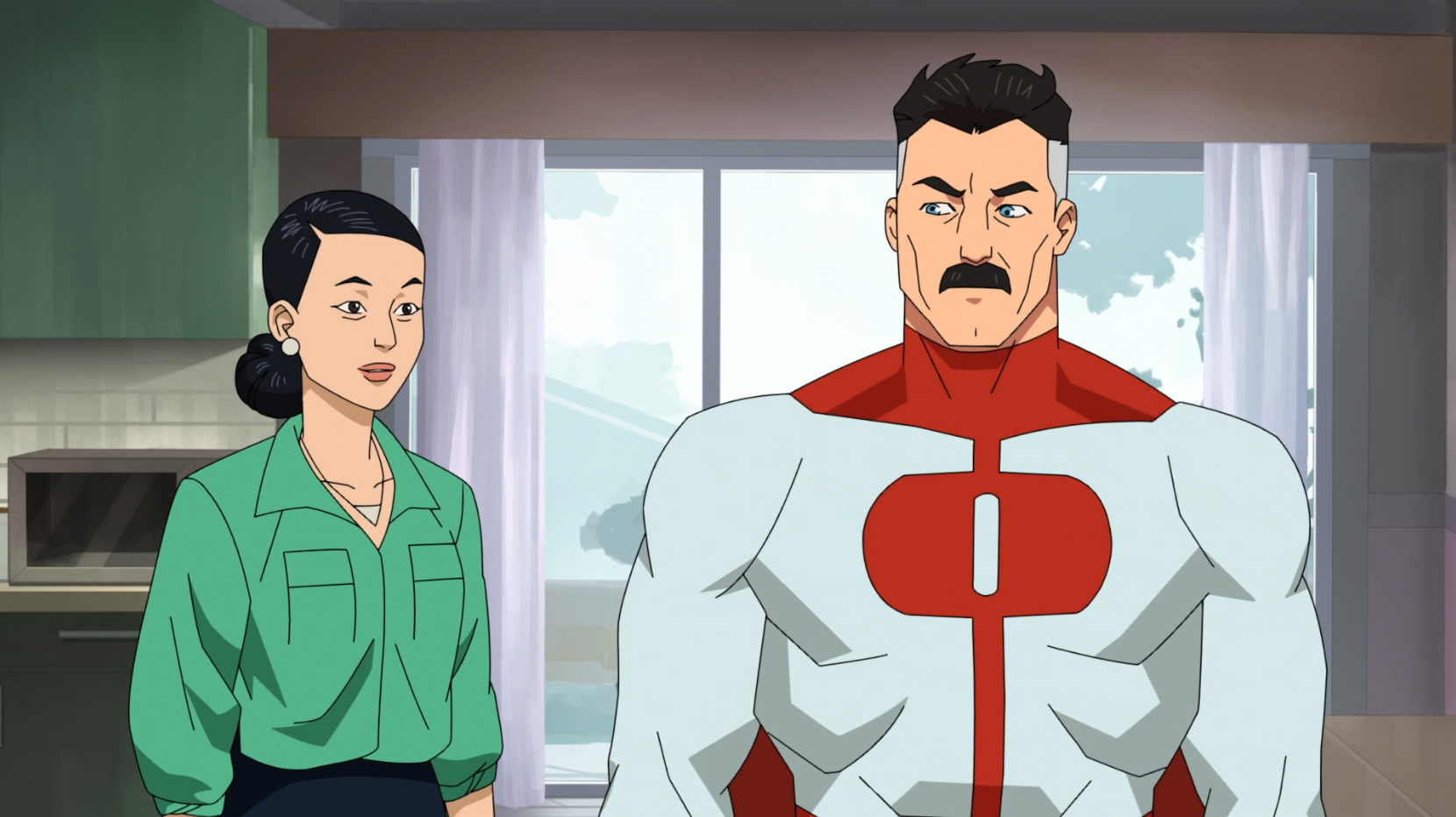 Nolan Grayson, known to the world as Omni-Man, is Earth's most powerful defender and a member of the Viltrumite race. This first appearance highlights the duality of his life: wearing a bright superhero uniform while standing in a mundane domestic setting, setting the stage for the complex family dynamics of the show.