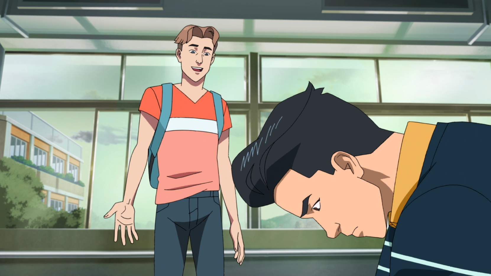 William Clockwell makes his debut as Mark Grayson's loyal and observant best friend at Burger Mart and school. Known for his quick wit and being the first person to learn Mark's secret, this scene establishes their close friendship and William's role as the grounded civilian perspective in Mark's increasingly chaotic life.