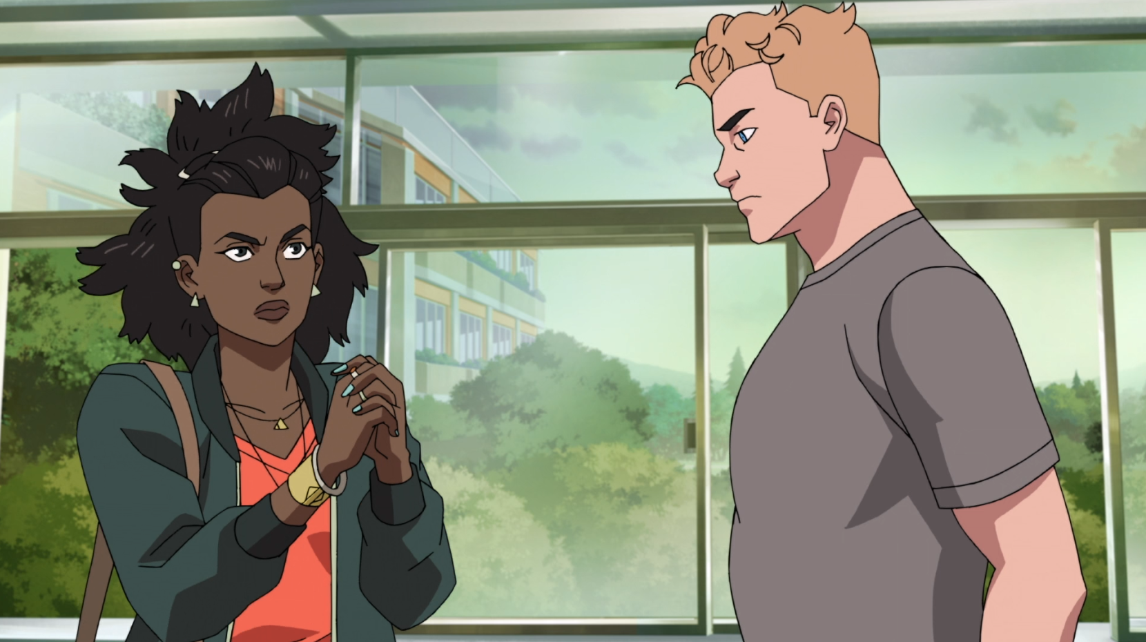 Amber Bennett is introduced at Reginal Vel Johnson High School in Season 1, Episode 1. A smart, independent student who doesn't tolerate bullies, she is shown here standing her ground during an encounter with Todd. This scene establishes her character's strong moral compass and marks the beginning of her importance in Mark Grayson's social life.