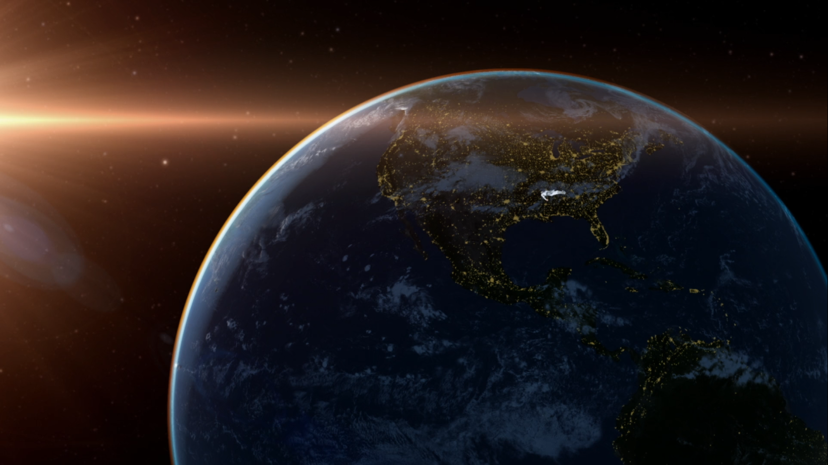 In a flashback during the series premiere, Nolan Grayson recounts his arrival on Earth. This shot shows him as a lone traveler from Viltrum, appearing as a shooting star over the North American continent. It serves as the visual beginning of his 'Omni-Man' persona and his mission to protect the planet.