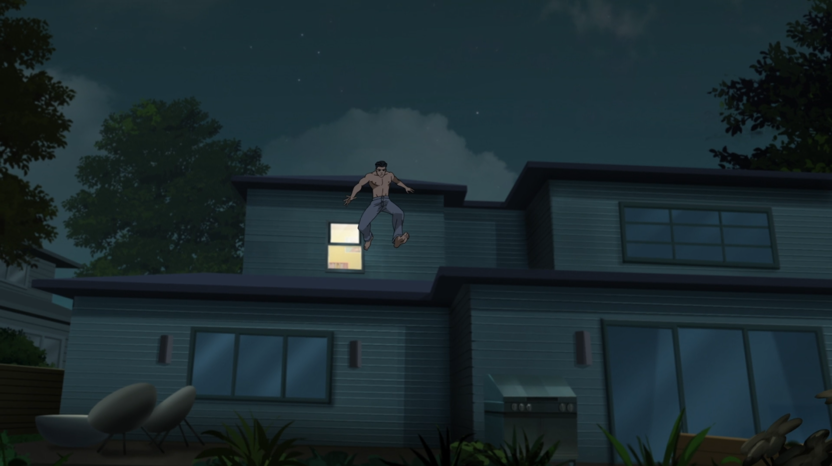 The moment Mark Grayson has been waiting for finally arrives in the series premiere. After years of anticipation, he discovers he can levitate. This scene captures the clumsy, unrefined nature of his first attempt at flight in his backyard, contrasting the effortless grace of his father.