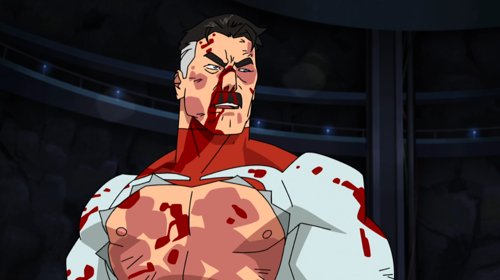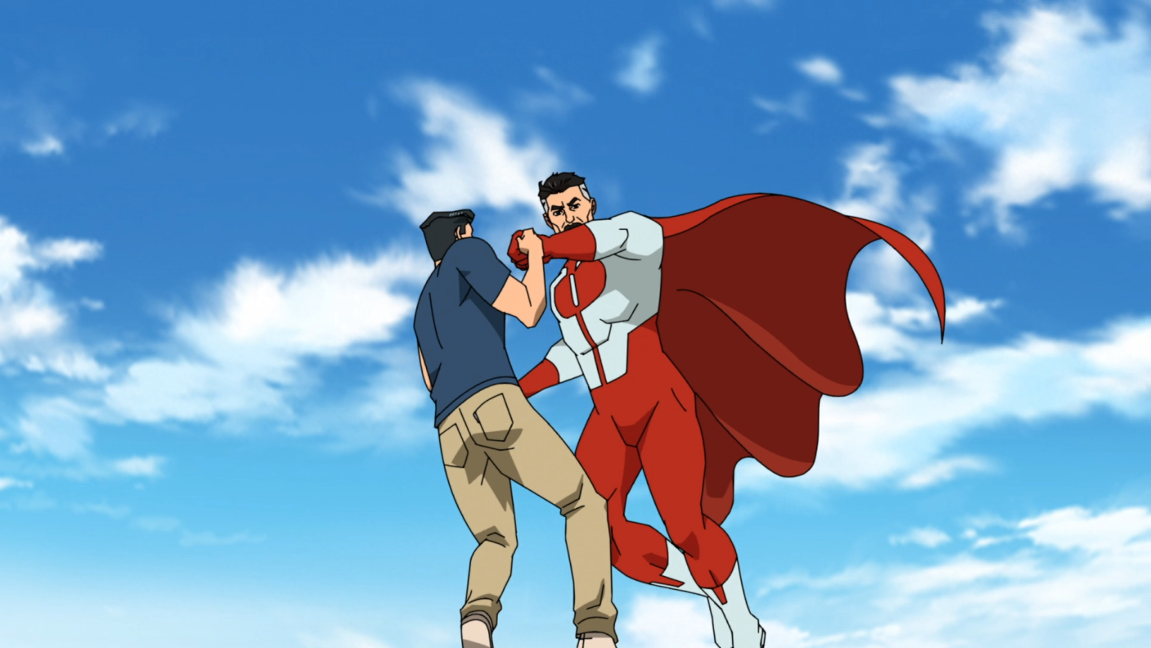 Omni-Man coaching Mark on the finer points of combat and power delivery.