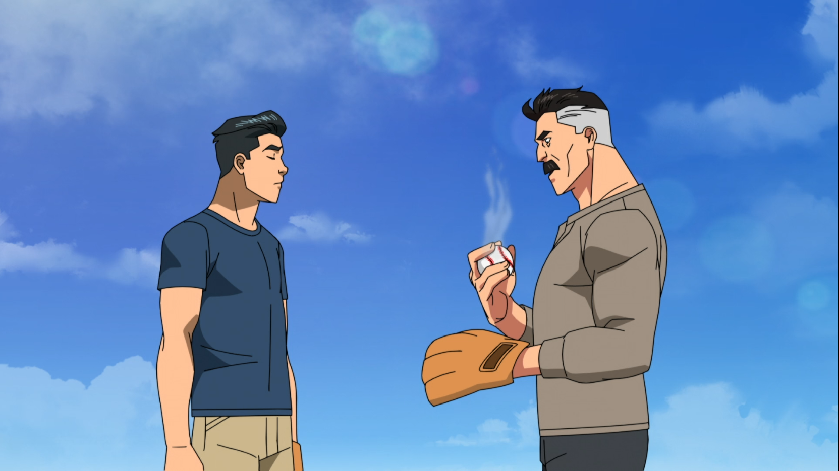 In one of the most memorable scenes from the pilot, Nolan takes Mark above the atmosphere for a 'traditional' father-son activity. Playing catch while flying across the globe demonstrates the casual nature of their god-like abilities. It serves as a poignant moment of connection that emphasizes the human side of the Viltrumite experience before the episode's tragic ending.