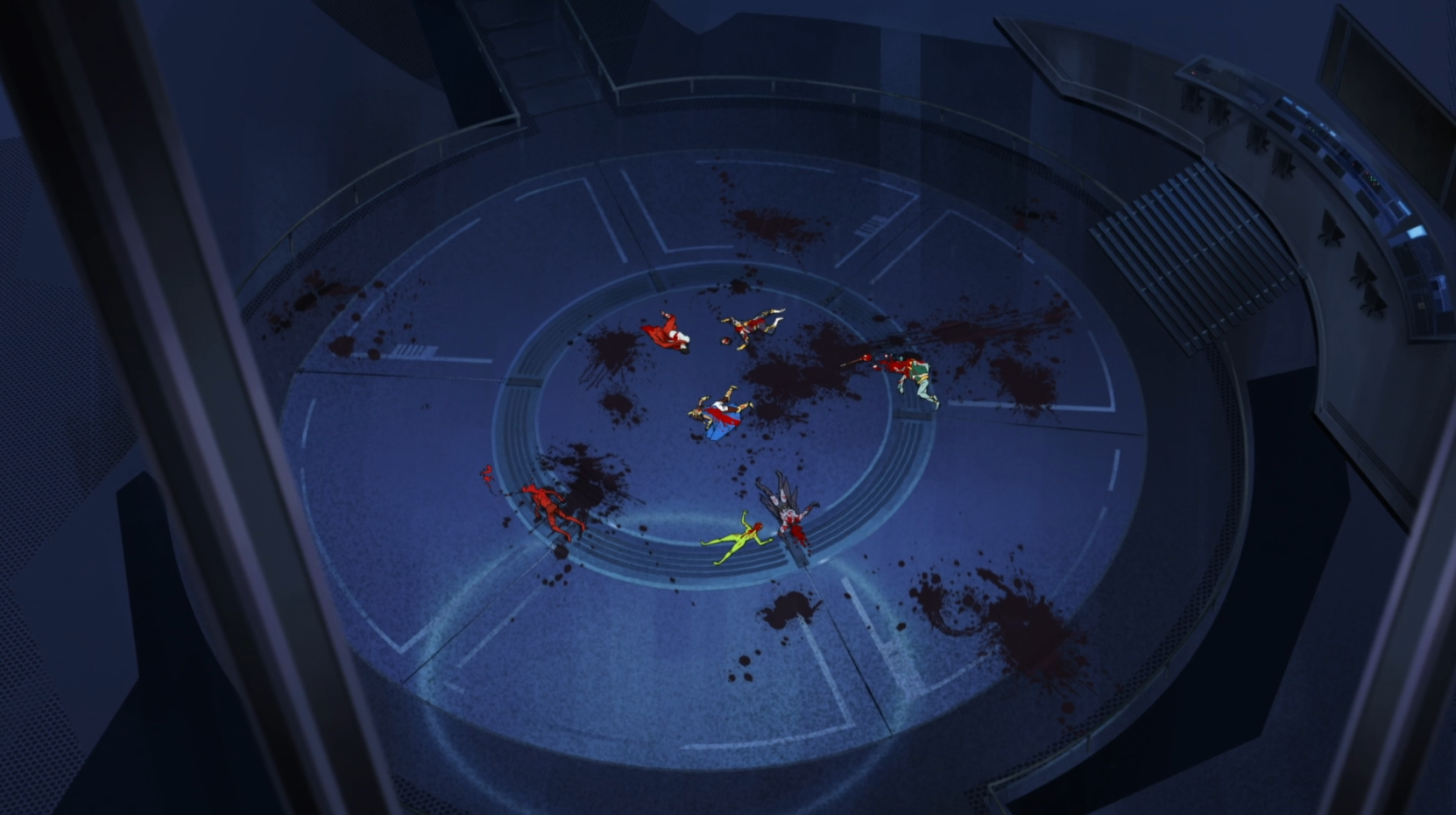The beginning of the end: The Guardians of the Globe face off against Omni-Man in their secret base.