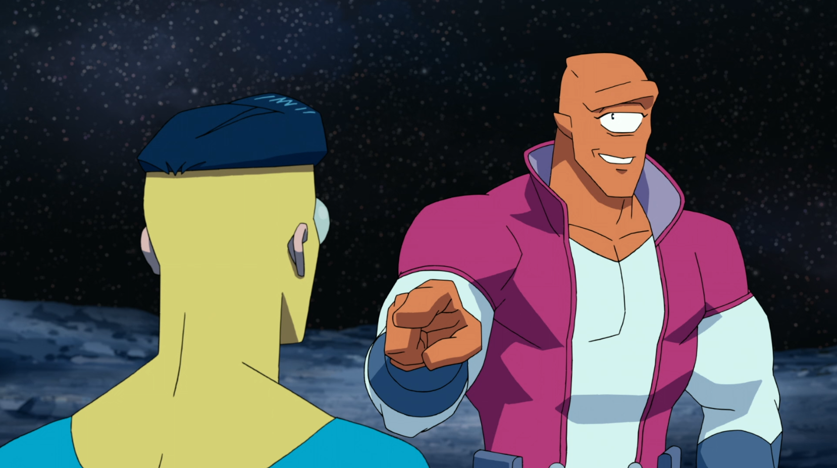 After realizing their initial skirmish was based on a misunderstanding, Allen the Alien formally introduces himself to Mark. This conversation on the lunar surface reveals that Allen is an Evaluation Officer for the Coalition of Planets who had been testing Earth's 'champion' for years—only to realize he had been visiting the wrong planet. This moment shifts the tone from conflict to camaraderie, establishing a vital alliance for Mark's future and expanding the series' scope to the stars.