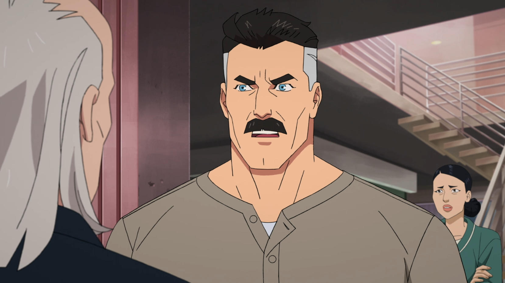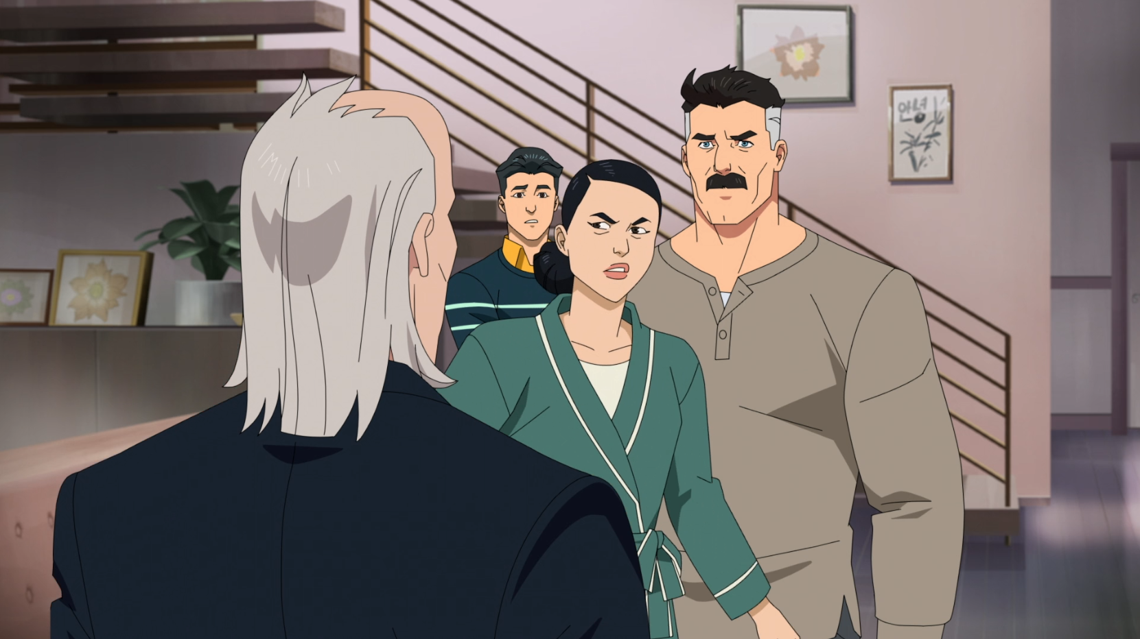 In a high-tension moment toward the end of Episode 2, Cecil Stedman visits the Grayson home under the guise of a check-in. While not making an outright accusation, Cecil’s probing questions about the specifics of the Guardians' massacre clearly strike a nerve. Nolan’s temper visibly flares, his calm fatherly facade momentarily slipping to reveal the intimidating warrior beneath. This scene marks the beginning of the cold war between the GDA and Omni-Man.