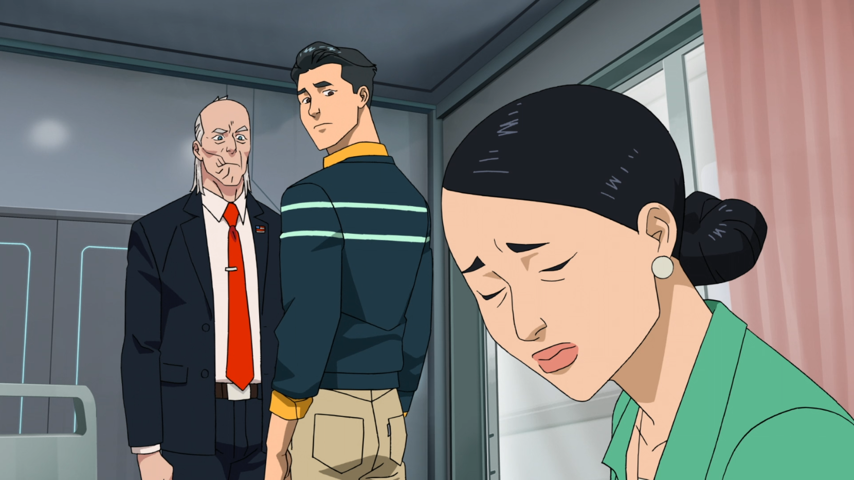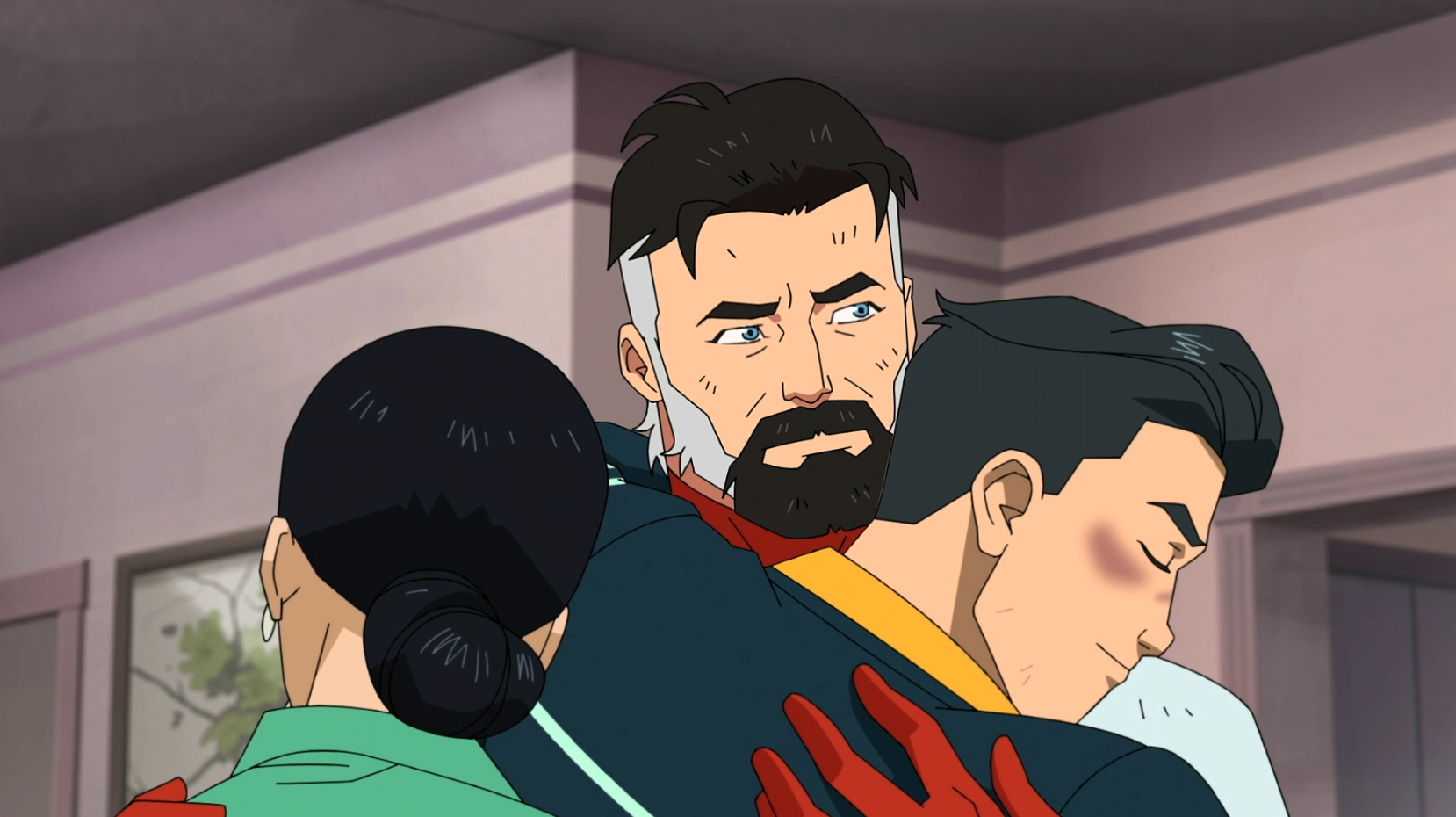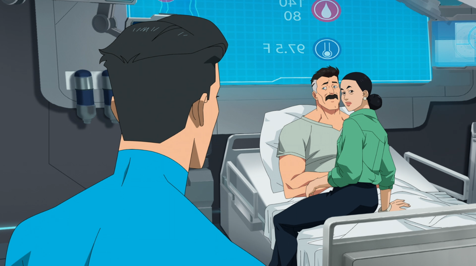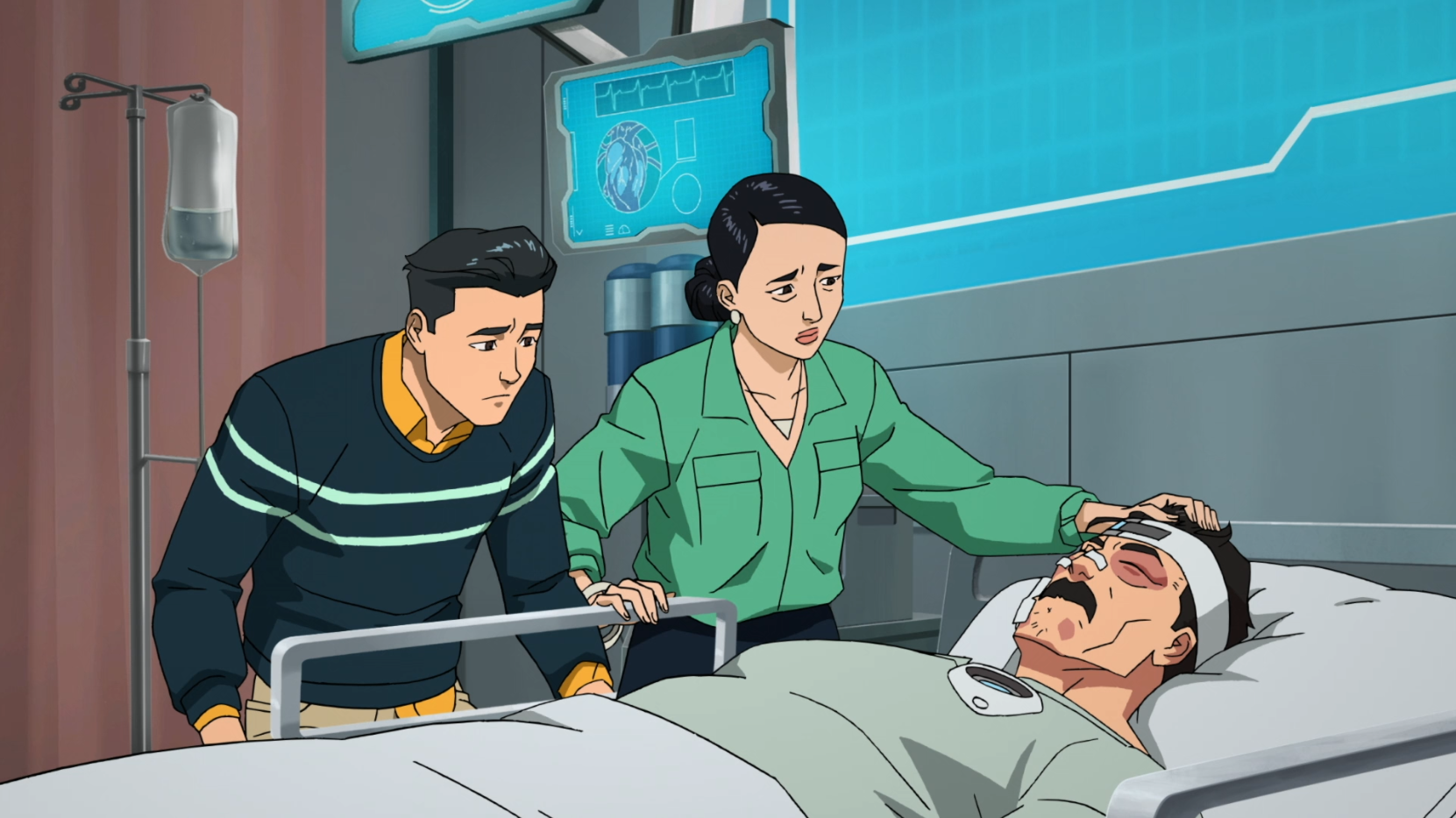 In a somber moment from Episode 2, Mark and Debbie finally reach Nolan's bedside. Nolan, usually seen as the invincible Omni-Man, is portrayed here as vulnerable and broken, covered in medical sensors and breathing apparatuses. This scene is a masterful piece of dramatic irony: while the family grieves for his injuries, the audience is aware that he is actually the perpetrator of the massacre that put him there.