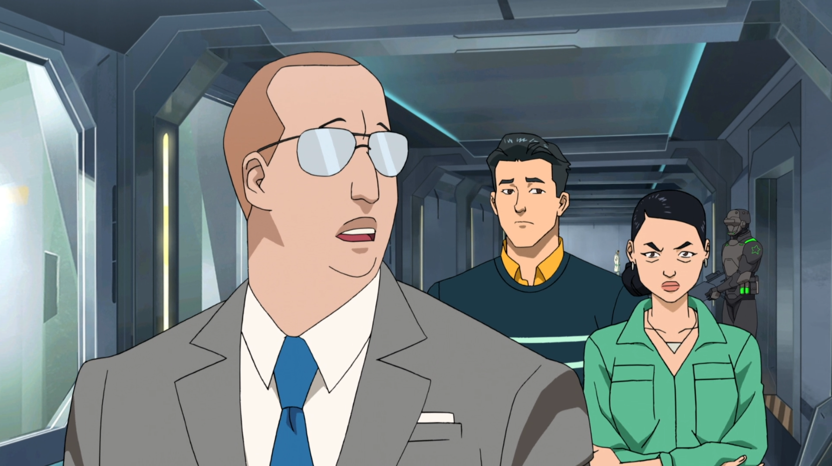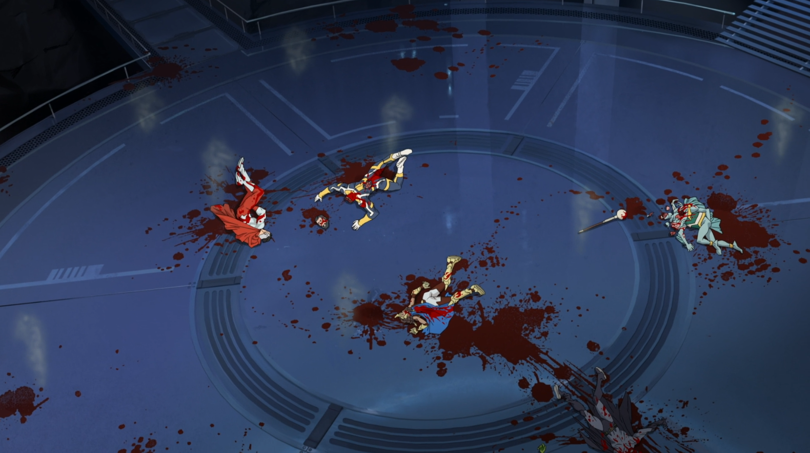 In the opening of Episode 2, the Global Defense Agency (GDA) descends upon the Guardians' secret base. This scene highlights the clinical and high-tech cleanup operation led by Cecil Stedman’s team. As they recover the bodies of the fallen heroes and a critically injured Omni-Man, the cold, professional response of the GDA contrasts with the sheer brutality of the violence that occurred in this space.