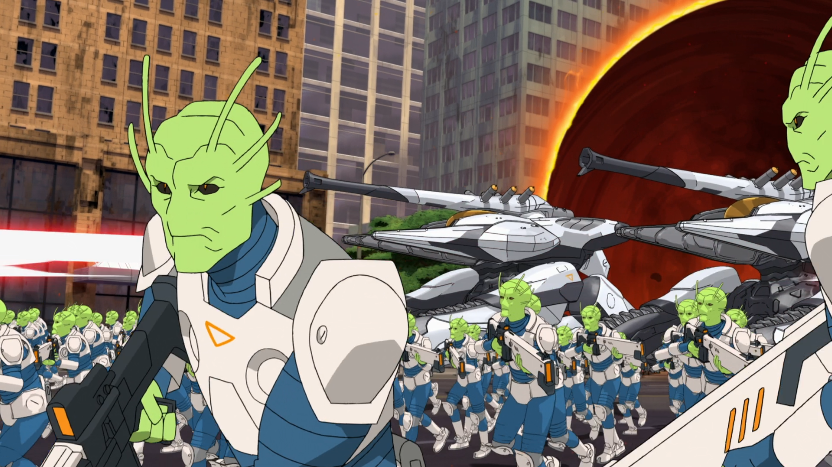 The Flaxans make their debut in Episode 2, 'Here Goes Nothing,' as they launch an interdimensional assault on Earth. These technologically advanced invaders come from a dimension where time moves significantly faster than on Earth. This initial skirmish marks the beginning of a recurring conflict, as the Flaxans use each subsequent invasion to learn from their previous defeats and upgrade their gear to counter Earth's defenders.