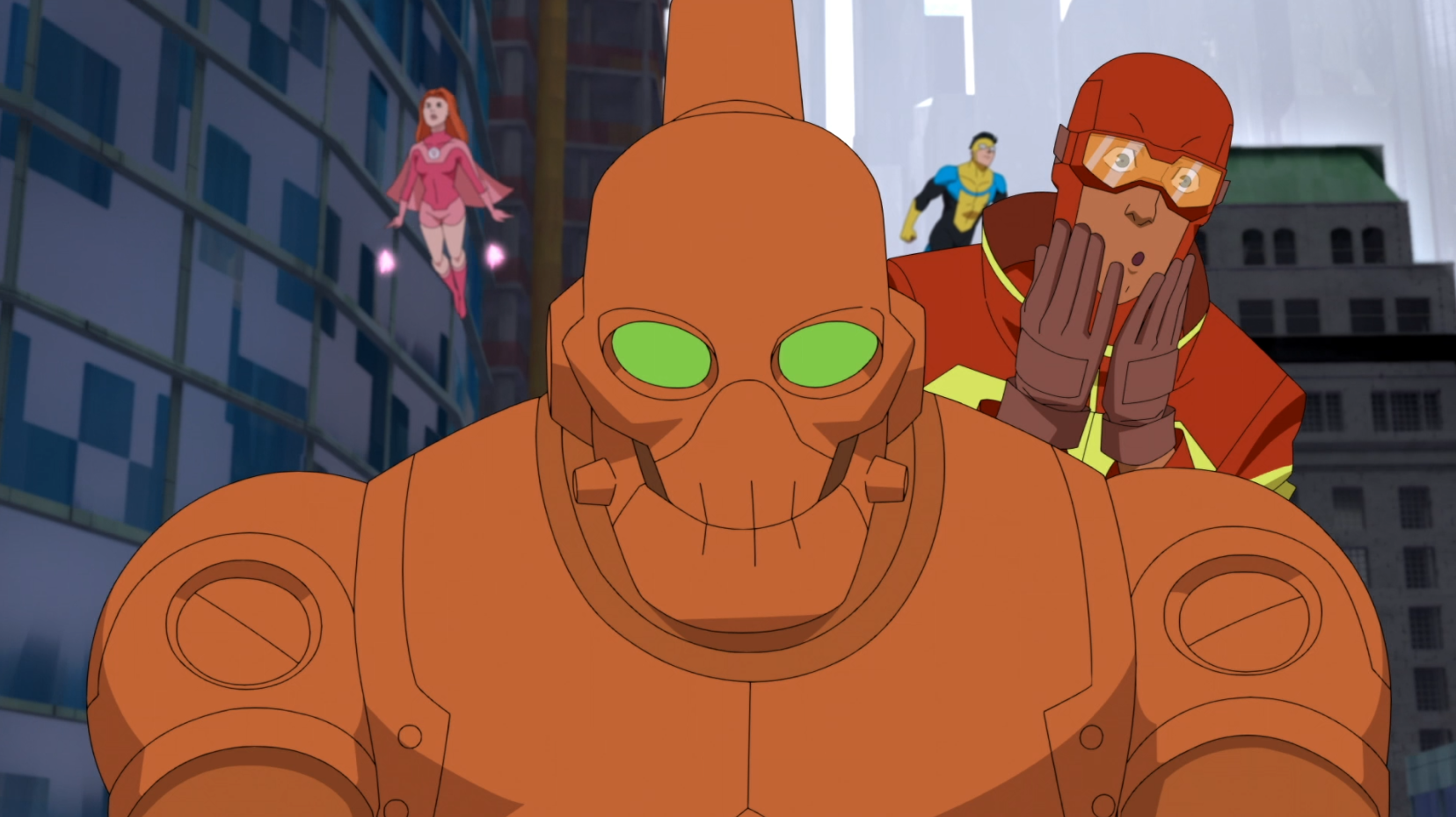 As the Flaxan invasion overwhelms local authorities, the Teen Team makes their coordinated debut. Led by the tactical genius Robot, the group consists of Rex Splode, Dupli-Kate, and Atom Eve. This moment marks Mark Grayson's first encounter with other super-powered peers, shifting the dynamic from a solo mission to a team-based defense of the city.