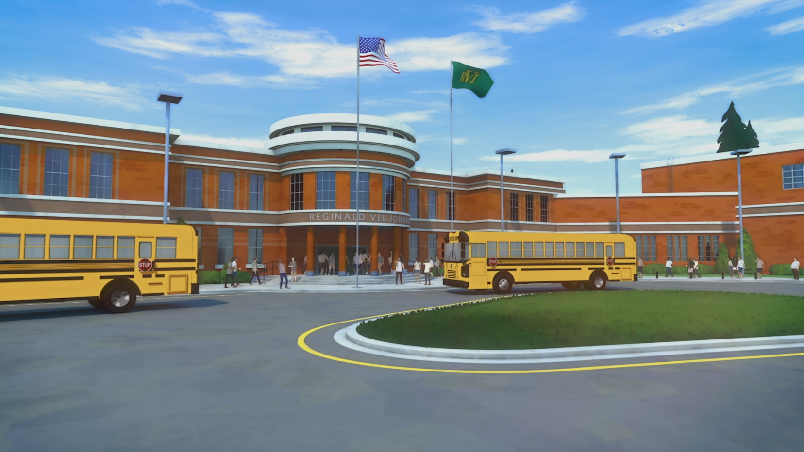 A transition shot of Reginald VelJohnson High School, the primary setting for Mark's civilian life. Named after the actor who voiced the principal (and famous for his roles in 'Die Hard' and 'Family Matters'), the school represents the 'normal' world Mark is trying to protect. It's here that he interacts with his best friend William and his crush Amber, highlighting the constant struggle to balance homework with heroics.