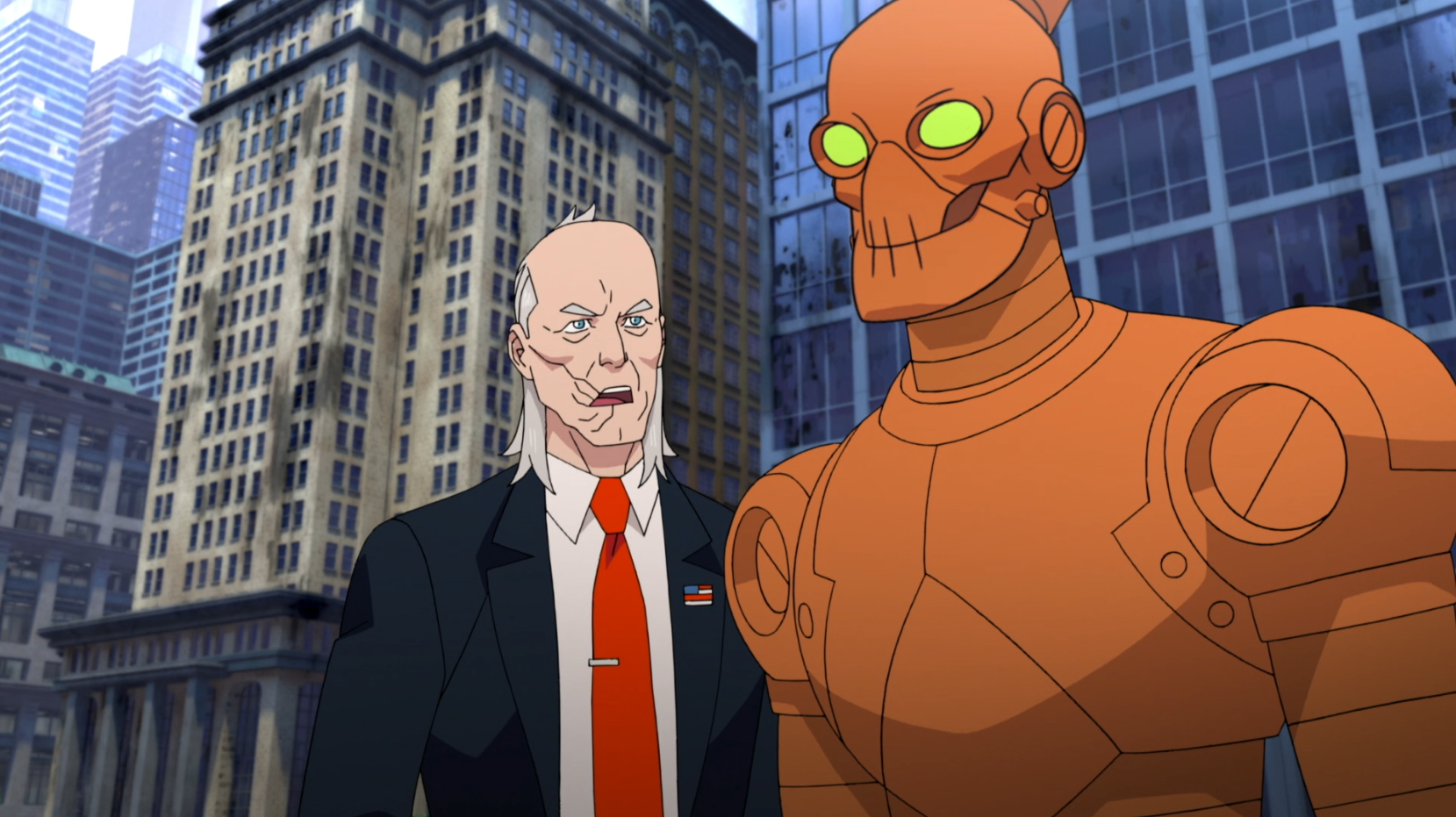 After the initial retreat of the Flaxans, Cecil Stedman and Robot evaluate the battlefield. This interaction highlights Robot's role as a cold, analytical strategist whose intellect rivals the GDA’s technology. As they examine the leftover alien tech, Cecil begins to see the Teen Team—and Robot in particular—as potential candidates to fill the power vacuum left by the Guardians of the Globe.
